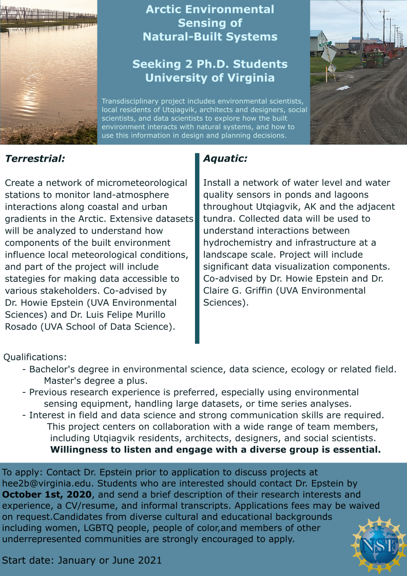 We’re hiring two Ph.D. student on the project, see the ad below! Howie Epstein will be the lead advisor, and I’ll co-advise one student working on aquatic systems. This will be a big, cooperative project, though, and both students will likely interact with the whole team.